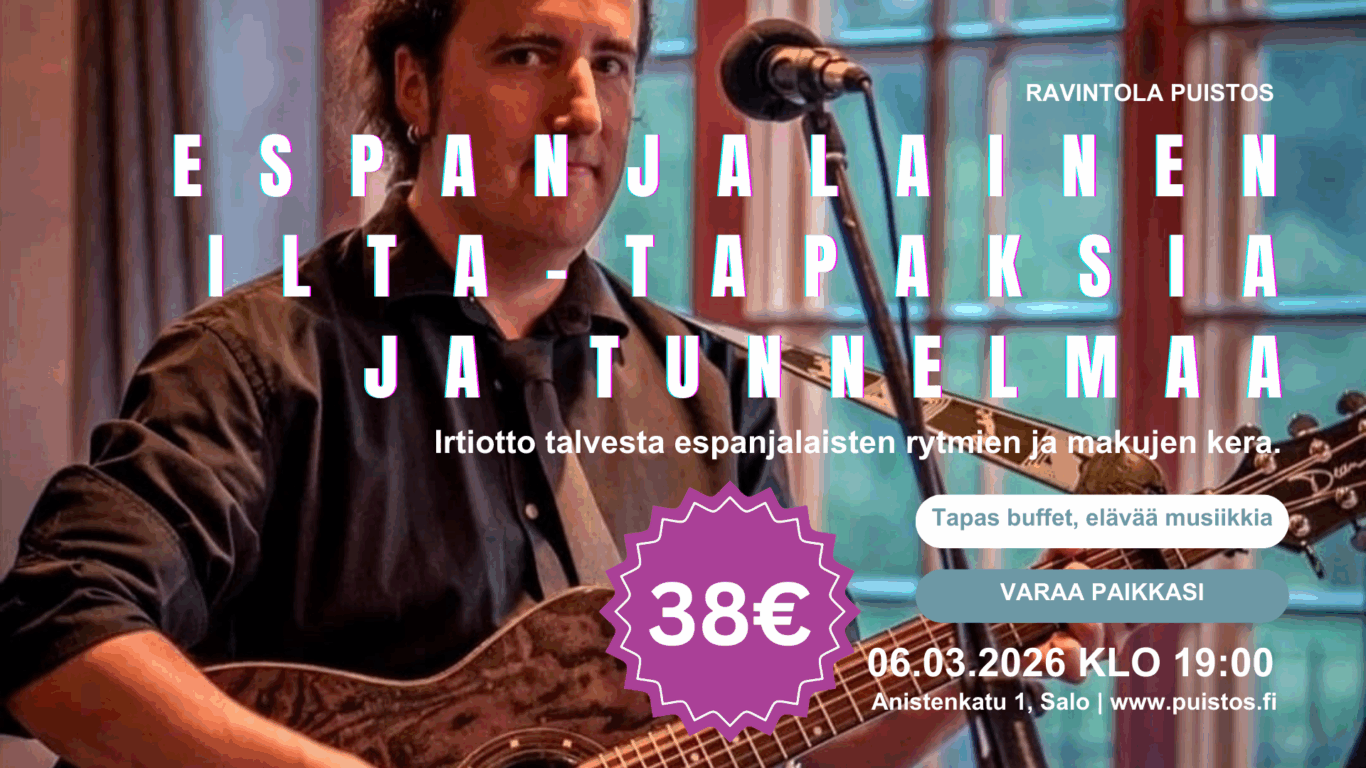 Espanjalainen ilta – Tapaksia ja tunnelmaa. Kutsumme sinut hetkeksi irti kylmästä nauttimaan Espanjan rytmeistä, mauista ja iloisesta tunnelmasta.