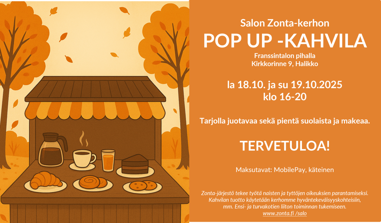 Zonta-järjestö tekee työtä naisten ja tyttöjen oikeuksien parantamiseksi. Kahvilan tuotto käytetään Salon Zonta-kerhon hyväntekeväisyyskohteisiin, mm. Ensi- ja turvakotien liiton toiminnan tukemiseen.