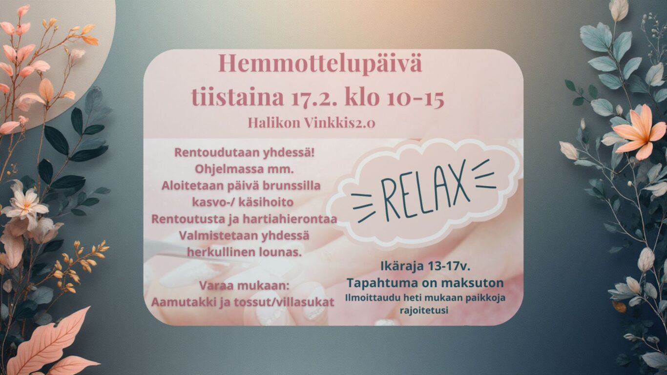 Hemmottelupäivä Halikon Winkkiksellä (Hornintie 5b, 24800 Halikko) tiistaina 17.2. klo 10.00-15.00. Päivä on tarkoitettu 13-17-vuotiaille nuorille.