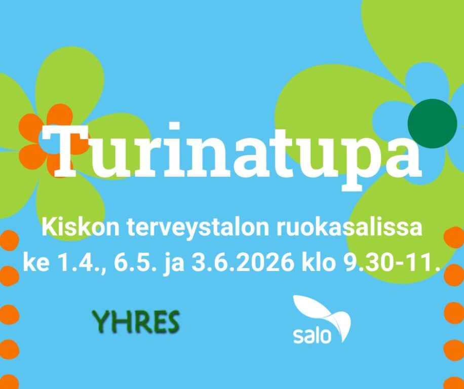 Turinatupa Kiskon terveystalon ruokasalissa keskiviikkoisin 6.5. ja 3.6.2026 klo 9.30-11.
