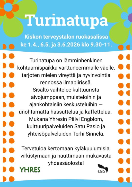 Turinatupa Kiskon terveystalon ruokasalissa keskiviikkoisin 1.4., 6.5. ja 3.6.2026 klo 9.30-11.